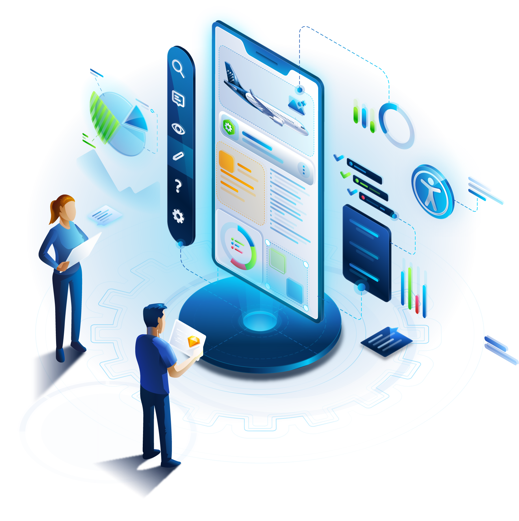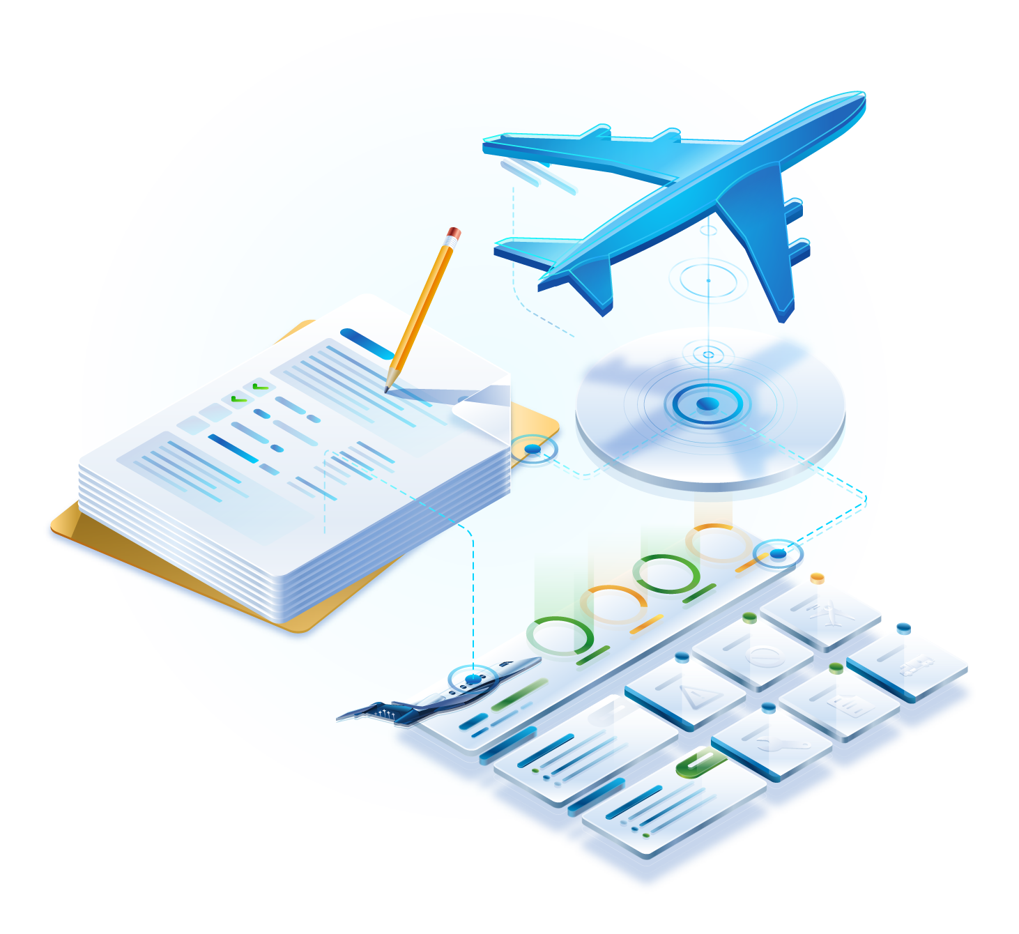 All graphics were created with two main subjects in mind: aviation and tech, and how well the two are tied together, using iconography to better establish the bigger picture of the content at hand, such as using shields to symbolise safety, spanners and cogs for maintenance, “text” boxes and ticks for defect task list, and so on.